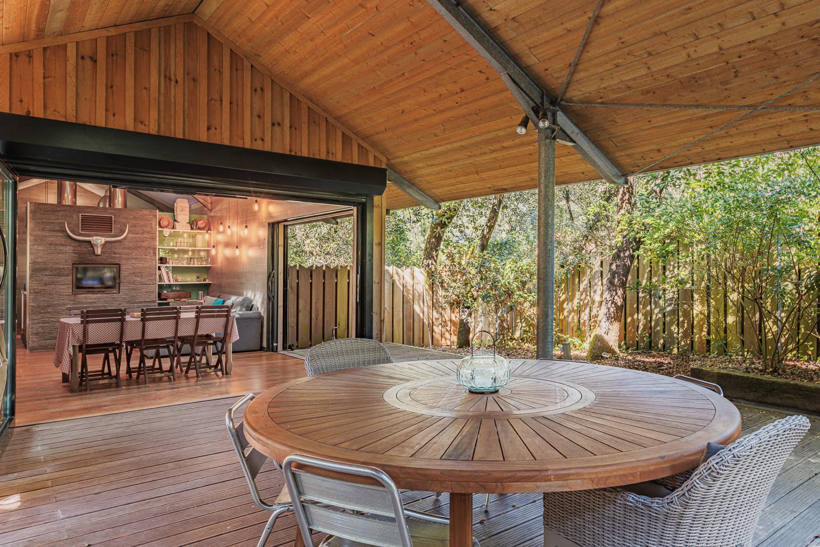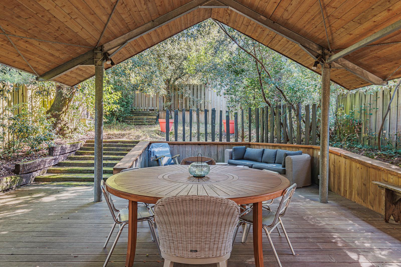 Les arbres, majestueux, enveloppent la maison d’un manteau vivant et protecteur, dessinant un décor confidentiel où règnent sérénité et déconnexion.